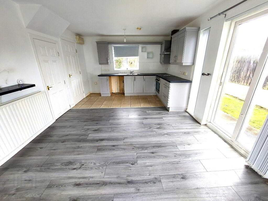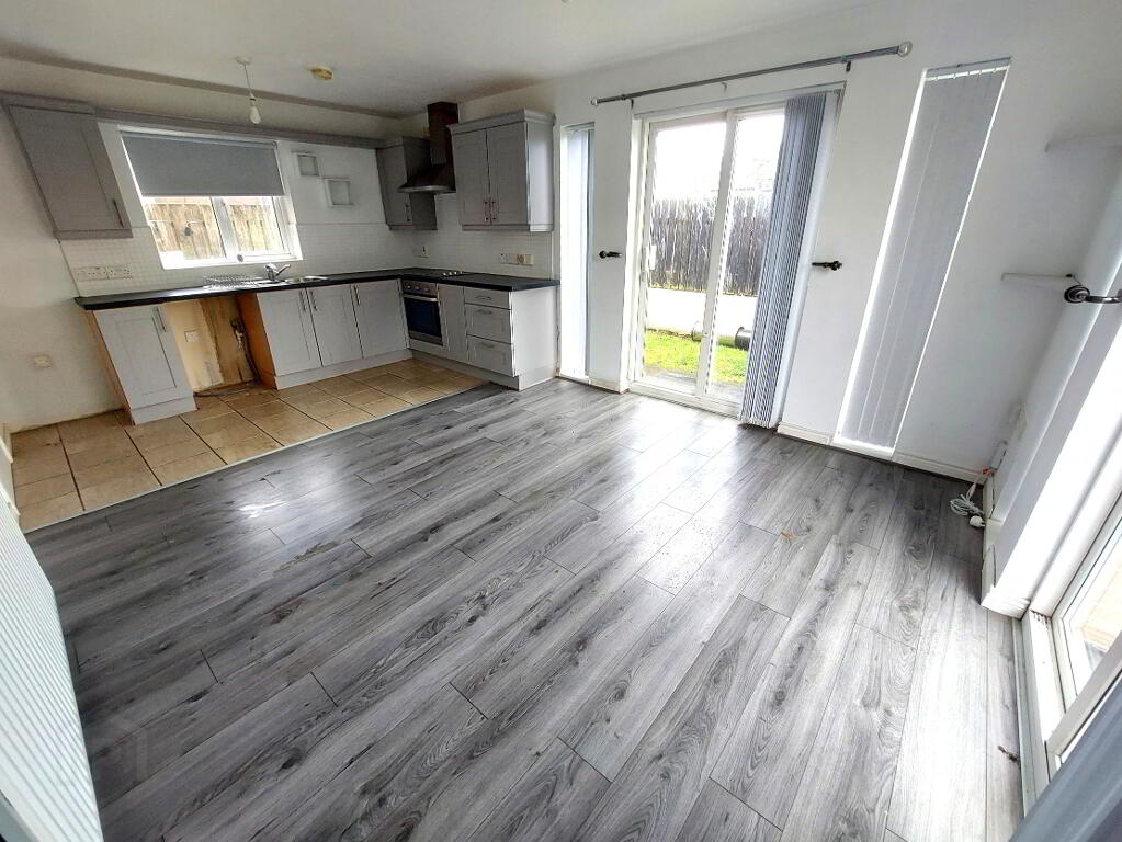 Part tiled floor and part laminate wooden floor, range of eye level and base units with worktop space over, stainless steel sink, integrated oven and hob with extractor fan over, tiled splashbacks, space for washing machine and fridge freezer, built in storage cupboard, 4 windows, 2 patio doors, 1 radiator, power points, tv point and telephone point, door to: